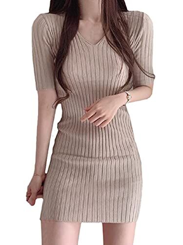 [ココアンドユカ] タイト Vネック リブ ニット ミニ ワンピース 半袖 シンプル レディース セクシー 五分袖 (ベージュ, M) COCO&YUKA(ココアンドユカ) Amazon chocol raffine robe ロングソフトマーメイドスカート / レディース 春 夏 マキシ フレア ギャザ…